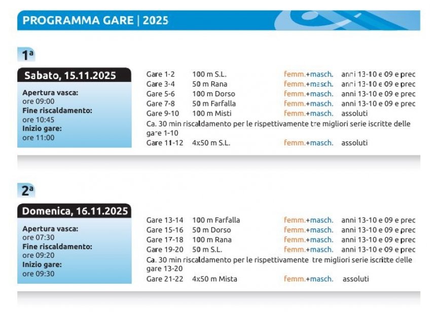 La Società organizzatrice si riserva il potere di cambiare il programma per problemi tecnici o organizzativi. La Società organizzatrice si declina ogni responsabilità per incidenti, furti o danni di ogni genere. Nella piscina è da rispettare il regolamento dell’impianto.